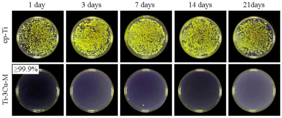 Figure 6 shows the S. aureus colonies on Ti-3Cu-M samples which have been immersed in 0.9%NaCl solution for different durations. There were almost no colonies on the surfaces of Ti-3Cu-M samples and the antibacterial rates were more than 99.0% even after 21 days immersion, demonstrating the strong long-term antibacterial property of the Ti-3Cu-M sample.