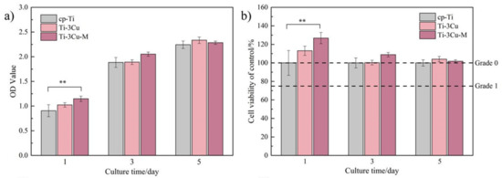 Figure 7a shows the OD values of MC3T3-E1 cells co-incubated on the samples for different duration. From Figure 7a, the OD values of all groups increased with the extension of culture time, indicating the good growth condition of MC3T3 cells on samples. On the first day, the OD value on Ti-3Cu-M was significantly higher than that on cp-Ti sample while there was no significant difference between cp-Ti and Ti-3Cu sample. On the third day, the OD value on Ti-3Cu-M was still higher than the values on the other two samples but there was no significant difference among different samples. A similar situation was also found on the seventh day. The calculated relative growth rates (RGR) of cells in Figure 7b also show that the cell viability on the Ti-3Cu and Ti-3Cu-M samples was higher than 100%. All these results demonstrate that both the Ti-3Cu and Ti-3Cu-M sample exhibited no cell toxicity (Grade 0 in comparison with cp-Ti) to MC3T3 cell line and the surface modification could promote the early proliferation of MC3T3 cells to some extent.