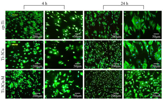 Cell biocompatibility assess results have demonstrated that Ti-3Cu and Ti-3Cu-M samples had no cytotoxicity to the MC3T3 cell line, while the Ti-3Cu-M sample promoted the cell proliferation at the first 24 h, as shown in Figure 7a,b. Staining image also confirmed that some cells on the Ti-3Cu-M sample at 4 h began to have filament-like pseudofoot protrusions, showing good adhesion and spreading ability. The number and spreading area ontheTi-3Cu-M sample was larger than the value on the cp-Ti control group. However, the staining image at 24 h showed that there were more cells on the Ti-3Cu-M sample than cp-Ti and the Ti-3Cu sample, but the spread condition of individual cells, including the cell shape, the pseudopodia and the spread area was not significantly changed in comparison with cp-Ti and the Ti-3Cu sample.