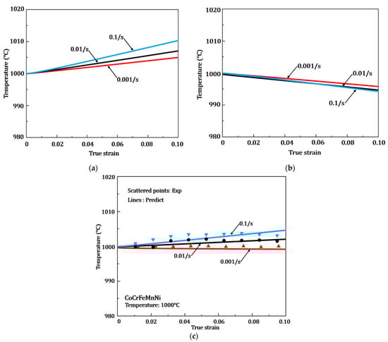 - The applied adiabatic and proposed heat dissipation equation can describe the variation of the temperature for the CoCrFeMnNi high-entropy alloy under Gleeble hot compression tests. The comparison of temperature variation between experiment and prediction at three strain rates (0.001/s, 0.01/s and 0.1/s) of 1000 °C obtains a good agreement by calculating R-value (all higher than 0.85) and AARE (all lower than 0.03).