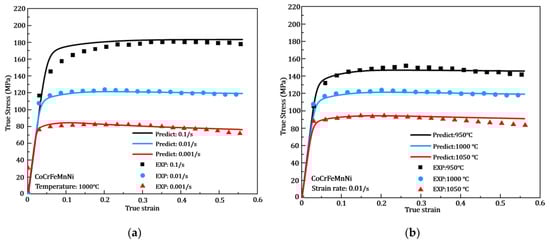 Figure 3 compares hot compression behavior between constitutive model prediction (solid lines) and experimental results (scattered points). The comparison results are divided in Figure 3. Figure 3a is the results under a temperature 1000 °C (0.001/s, 0.1/s and 0.1/s), and Figure 3b is the results under strain rates 0.01/s (950 °C, 1000 °C and 1050 °C). The good agreement of the fitting performance can be seen from the two result figures, with the hardening stage (dislocation accumulation) and softening stage (dynamic recrystallization) of the stress–strain curves under different conditions. All the curves show a similar trend that the peak of the flow stress increases as the strain rate increases and the deformation temperature decreases, which due to the high strain rate causes fast dislocation accumulation, and recrystallization and dynamic recovery are not activated at a low temperature, which leads to a high-stress level.