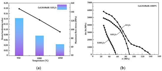 Hardening performance of the CoCrFeMnNi: (a) strain hardening component, n, (b) the hardening rate at 1000 °C (0.001/s, 0.01/s and 0.1/s).