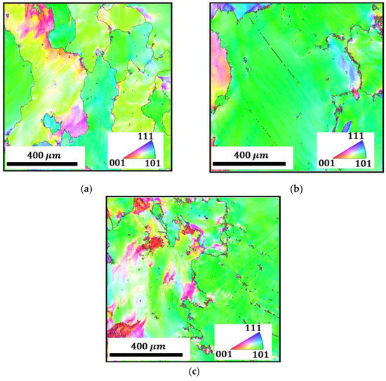 EBSD microstructure observations of different conditions: (a) 1000 °C–0.01/s–0.2; (b) 1000 °C–0.01/s–0.5; (c)1000 °C–0.1/s–0.5.