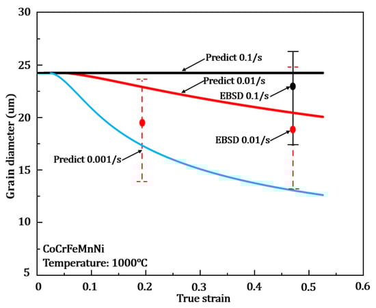 Figure 6 gives the EBSD grain size observations of typical conditions of 1000 °C–0.01/s–0.2, 1000 °C–0.01/s–0.5 and 1000 °C–0.1/s–0.5 to show the trend. The strain rate 0.001/s was not experimentally observed, so only the predicted result was given. EBSD observations were performed for the same conditions in Figure 5, giving the effect of strains and strain rates on the grain size evolution. For clarity, the error bars in the figure come from statical analysis on the grain sizes from the EBSD figure and can reflect the nature of the grain size distributions. Predicted curves within the error bar is considered acceptable. EBSD results are given in the form of error bars, and grain size evolution predicted by the modelling is within the observed range of EBSD results, which show the accuracy of the model predictions. The model predictions show that the grain size tends to become smaller as the strain accumulates. Particularly, the largest change in grain size was observed at 0.001/s, from original 23.91 to 5.76 . This is due to the refinement of grain size by recrystallization under a lower strain rate, and a lower strain rate leads to a longer soaking time at the high temperature deformation, leading to a more sufficient recrystallization time and the large change in grain size. However, the grain size shows no obvious change at a strain rate of 0.1/s, due to the fast deformation generating a large number of dislocations. However, the necessary soaking time is the key to triggering recrystallization, while a high strain rate lead to a short deformation time (within seconds), which may not provide sufficient energy for recrystallization to occur. Hence, no obvious grain size change may occur as predicted in the figure under this condition.