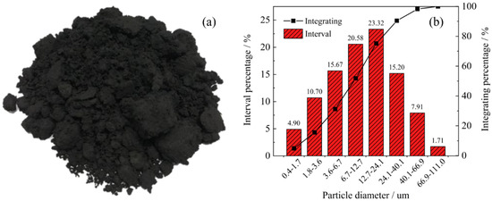 Macroscopic morphology and particle size characteristics of Panzhihua vanadium titanomagnetite. (a) Macroscopic morphology, (b) particle size distribution.