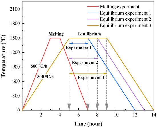 The synthetic ore was heated to 1500 °C at a heating rate of 300 °C/h under the protection of argon (3 L/min) and then maintained at constant temperature. The equilibrium experiment entered the melting stage, the melting stage time is the synthetic ore melting time in the melting pre–experiment.