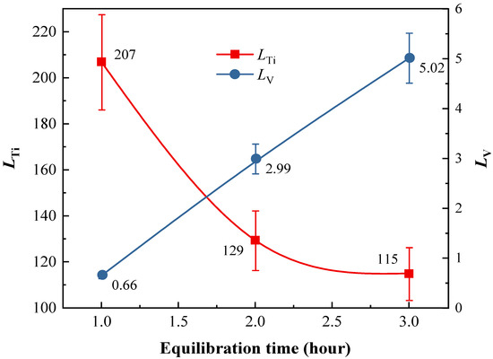 Figure 7 shows the change of vanadium and titanium distribution ratios (LV, LTi) with smelting time. As the smelting time was extended from 1 to 3 h, the LV rose from 0.66 to 5.02 and LTi declined from 206.90 to 114.86. The reason for this is that extending the smelting time increases the FeO content in the slag under a weakly oxidizing atmosphere, element V is oxidized to V2O3 by FeO. However, at the current FeO content, the restrictive step of titanium distribution behavior was the smelting time rather than the oxygen potential, therefore, the titanium distribution ratio decreased with increasing smelting time.