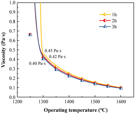 The ironmaking process is also a slag refining process, and the slag properties are critical to the process of HIsmelt smelting of vanadium–titanium magnetite. As a result, the changes in slag viscosity with temperature at different smelting times were calculated using FactSage, and the slag viscosity was corrected using the Einstein–Roscoe Equation, as shown in Equation (4).