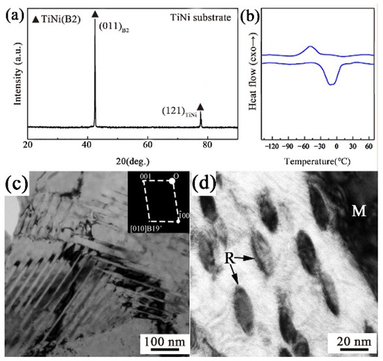 (a) XRD patterns of as-deposited Ti49.2Ni50.8; (b) DSC curve of as-deposited Ti49.2Ni50.8; (c) Bright-field TEM image showed that there were a significant amount of martensite lath in the sample; (d) Lenticular R phase is densely distributed around martensite.