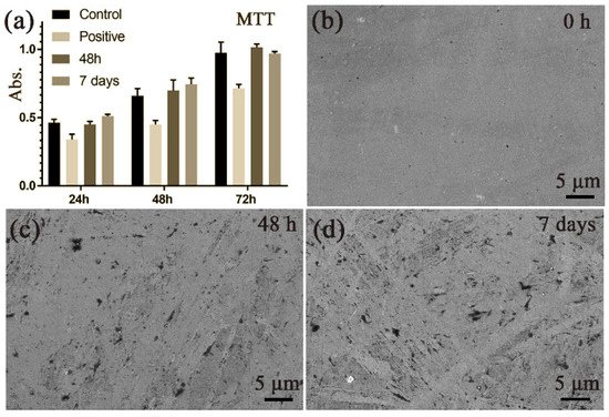 Biocompatibility test results of TiNi SMA prepared by LSF. (a) MTT test results of cell growth curve; (b) SEM image of sample surface morphology before MTT biological cell activity detection; (c,d) SEM images of the samples at 48 h and 7 days after MTT biological cell activity detection.