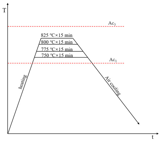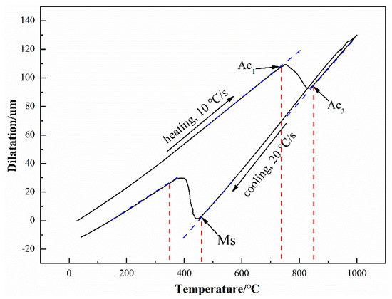 In order to design a reasonable austenitizing process, the Ac1 and Ac3 temperatures of the LH800 steel were measured first by employing a thermal dilatometer. The thermal expansion curve of the LH800 steel is shown in Figure 1, and the corresponding Ac1 and Ac3 temperatures were 726 °C and 850 °C, respectively. Subsequently, the 5% pre-strained steel sheet was heat-treated between Ac1 and Ac3 to evaluate the influence of austenitizing temperature on its work hardening behavior. The heat treatment process is shown in Figure 2.