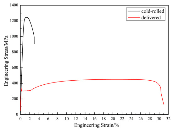 Engineering stress-strain curves of LH800 steel in cold-rolled and as-supplied state.