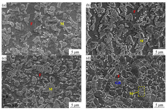 The microstructure of LH800 steel held at different temperatures for 15 min followed by air quenching: (a) 750 °C; (b) 775 °C; (c) 800 °C; (d) 825 °C. F: ferrite; M: martensite; GB: granular bainite; RD: rolling direction; ND: normal direction.
