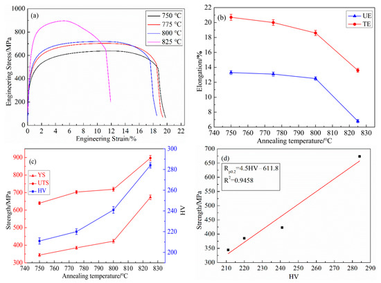 Mechanical properties of LH800 steel at different temperatures for 15 min followed by air quenching. (a) Engineering stress–strain curves of LH800. (b) Changes in elongation of LH800. (c) Changes in yield strength, tensile strength, and Vickers hardness of LH800. (d) The relationship between yield strength and Vickers hardness. (UE: uniform elongation; TE: total elongation; YS: yield stress; UTS: tensile stress; HV: Vickers hardness).