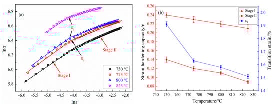 (a) The lnσ vs. lnε plots for the Hollomon model of LH800 steel. The slope of the line segment is n; εt is the transition strain between each deformation stage. (b) Effect of austenitizing temperature on the work hardening behavior of each stage and the transition strain in the Hollomon model of LH800 steel.