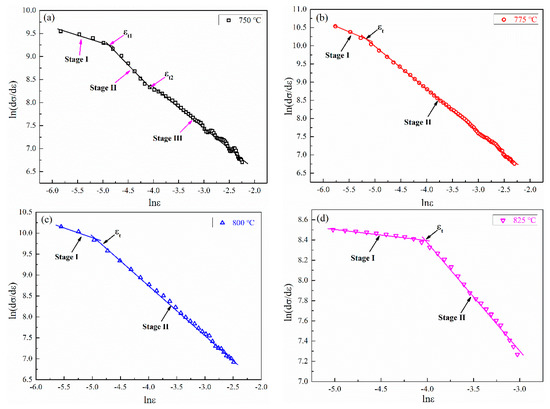 The ln(dσ/dε) vs. lnε plots for the DC-J model of LH800 steel at different austenitizing temperatures: (a) 750 °C; (b) 775 °C; (c) 800 °C; (d) 825 °C.