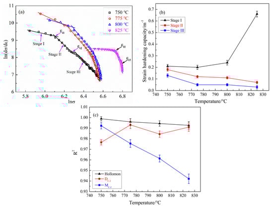 (a) The ln(dσ/dε) vs. lnσ plots for the MC-J model of the work hardening behavior of LH800 steel. (b) Effect of austenitizing temperature on work hardening ability of LH800 steel in the MC-J model. (c) The correlation coefficients (R2) of different models vary with austenitizing temperature.