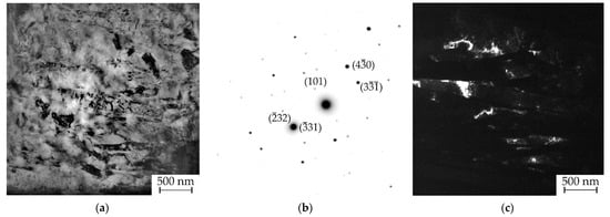 The bright-field microstructure image (TEM) of the initial samples (a); the microdiffraction pattern from the central zone of Figure 1a (b); the dark-field image, R phase reflection (c).