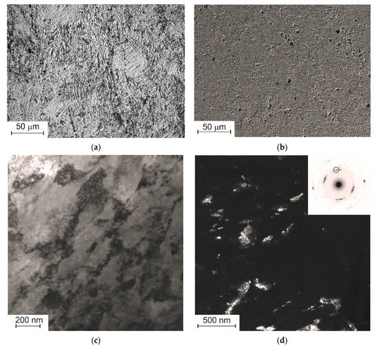 A typical intragrain microstructure of the initial coarse-grained samples, shown in Figure 1a, has a microband character. The maximum size of fragments in microbands does not exceed 500 nm. In the microdiffraction pattern, Figure 1b, obtained from the central zone of Figure 1a, there are reflections of the rhombohedral martensitic R phase. It follows from Figure 1c that the sizes of structure fragments of the R phase range from ≈50 to 400 nm. The bright-field image of the microstructure in Figure 2a demonstrates the presence of coarse grains in the structure of the samples after abc-pressing at 573 K with a true strain of 1.84. Figure 2a clearly shows the boundary of neighboring large grains. In the grain located on the right side of Figure 2a, an extended microband structure is revealed. The microdiffraction pattern obtained from the central region of this grain, Figure 2b, shows the presence of the R phase, the dark-field image of fragments of which is shown in Figure 2c. As the true strain increases to 5.40, 7.43, and 9.55, the microstructures of the samples are qualitatively similar. As an example, Figure 3 shows micrographs of the microstructure of the sample after abc-pressing to e = 5.4. Figure 3a,b show images of the surface obtained by optical microscopy and scanning electron microscopy, correspondingly. Large grains with a maximum size of up to 19 μm are detected by these methods. Figure 3c,d show TEM images of this sample in bright and dark fields, respectively. Figure 3c shows a bright-field image of a microstructure with a thin microband structure inside a grain of a larger scale level (macrolevel). The maximum size of fragments in microbands does not exceed 250 nm. It can be seen from Figure 3d that small fragments with the R phase structure are mainly localized along the boundaries of larger fragments.