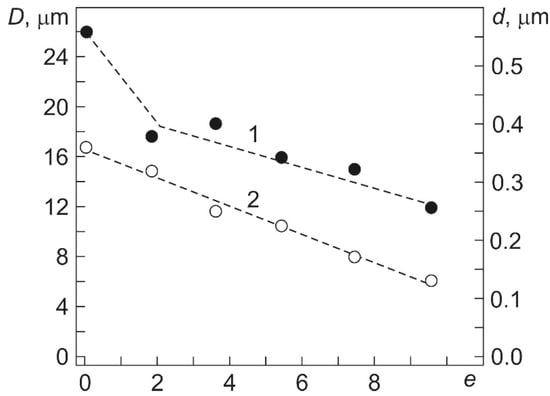 The average size of grains D (curve 1) and grain–subgrains d (curve 2) as the function of abc-strain, e.