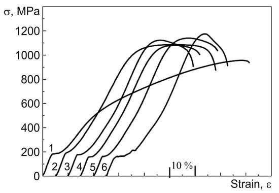 Engineering “stress–strain” curves during tension of titanium nickelide samples in the initial state (1) and after abc-pressing with e = 1.84 (2); 3.60 (3), 5.40 (4), 7.43 (5); 9.55 (6).