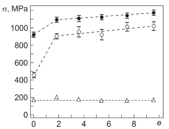 After abs-pressing, even at a true strain e = 1.84, the yield stress σy turned out to be 900 ± 25 MPa, which is more than twice as high as compared to σy in the initial state of the specimens. With a further increase in abc-strain, the yield stress continues to increase rather weakly and reaches 1000 ± 25 MPa at e = 9.55 (Figure 6). The ultimate tensile strength σUTS also increases most noticeably after e = 1.84, although this change is much smaller than the change in the yield stress. At the maximum value of the abc-strain given to the samples, their σUTS increased by about 15%.