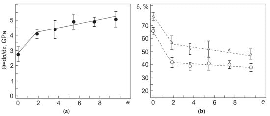 The value of the strain-hardening coefficient Θ also changes in a similar way (Figure 7a). An analysis of the σ(ε) diagrams showed that the elongation of the samples δ during their tension, both at the ultimate tensile strength and at failure, turned out to be quite high (Figure 7b). Thus, at the value of the maximum abc-strain e = 9.55, the uniform elongation of the specimens is about 40%. This figure also shows that already after the first cycle of abc deformation (e = 1.84), there is a sharp decrease in δ. With a further increase in e, the weak decrease in δ is observed, as shown in Figure 7b.