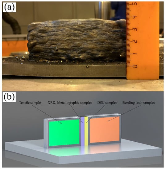 Two specimens in the form of a wall consisting of 20 layers were deposited. The direction of deposition was changed after each layer. The walls’ geometry was as follows: length—110 mm, width—10 mm, and height—38 mm. Figure 1 represents the as-deposited wall (a) and a schematic illustration of the samples’ position for the study inside both specimens (b). A second wall was used to investigate the influence of the heat treatment.