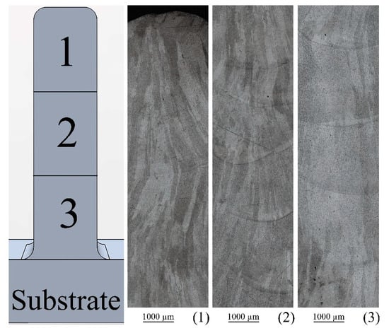 A panoramic image of the microstructure is shown in Figure 2. It should be noted that metal incorporates some small pores. The specimen has three major zones: a zone close to the substrate with large (350 μm in width and 1400 μm in height) columnar grains (Figure 2 (Zone 3)); a middle zone with smaller (270 μm in width and 1200 μm in height) columnar grains compared with the third zone (Figure 2 (Zone 2)); and the upper zone with the smallest columnar grains (250 μm in width and 1050 μm in height), which has small equiaxed grains on the top (Figure 2 (Zone 1)). Columnar grains are observed in the microstructure along the entire height of the deposited specimen to be crossing clearly visible fusion lines; thus, grains were formed during epitaxial growth. The crystallization front is directed from the lower layers to the upper ones. Since most of the volume of the specimen exhibits columnar grain growth, all the samples for the following studies were cut out of the metal with this microstructure.