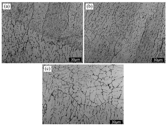 Microstructure of the typical (a) fusion line between the layers, (b) columnar grains observed along the entire structure, and (c) equiaxed grains visible on the top.