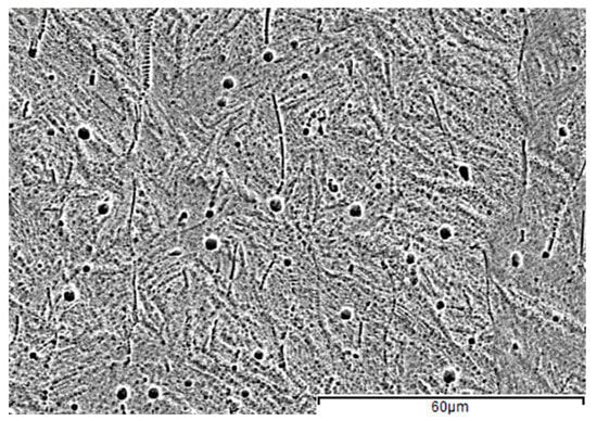 The SEM microstructure analysis of the heat-treated metal (Figure 5) shows the formation of new phases; for example, near-globular-shape dark points in the microstructure are either the traces of precipitates grinded during the metallographic preparation process or are precipitates themselves. Similar results were obtained in Reference [30]. On the basis of the literature review on the heat treatment, it is believed that the precipitates are Ti2Ni [31]. Phase composition are discussed further in Section 3.4.