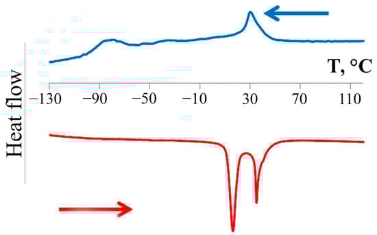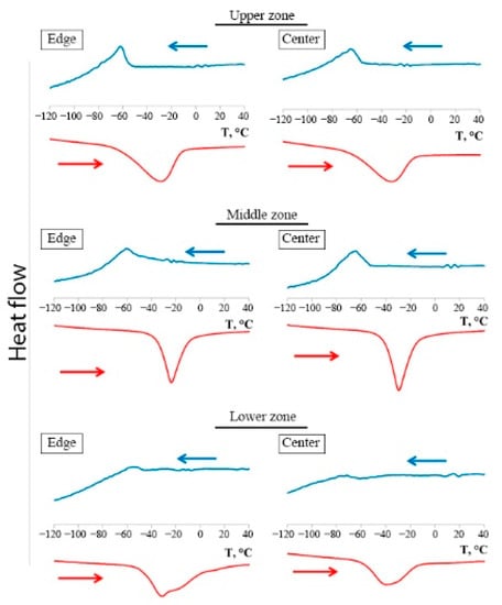 The original calorimetric curves (DSC) of the samples cut from different zones of the specimen are shown in Figure 7, grouped by zones: on the left are DSC curves related to the edge of the specimen, from the right to the central axis of the specimen.