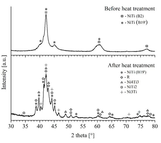 In order to determine the phase composition of the obtained specimens and investigate its changes after heat treatment, the specimens were subjected to an X-ray analysis. The as-deposited specimen’s and the heat-treated specimen’s phase compositions were studied; the results are presented in Figure 9. The X-ray diffraction data show that the as-deposited specimen is presented not only by the B2 matrix but with some amount of B19′ phase. This fact can be associated with the stress-induced MT as a result of residual stress generated during the deposition process [23]. In regard to aging at 430 °C, 1 h provides the formation of a finely dispersed Ni4Ti3, NiTi2, and Ni3Ti phases and changes the prevailing phase from a previously B2 + B19′ combination to B19′ + R. The formation of the R phase instead of the B2 phase is confirmed with the DSC results (see Figure 7) for the heat-treated specimen. It should be noted that the retained B2 phase in the XRD results was not observed in the heat-treated specimen. This fact can be associated presumably with an extremely low amount of the B2 phase and the overlapping of the different phases’ peaks.