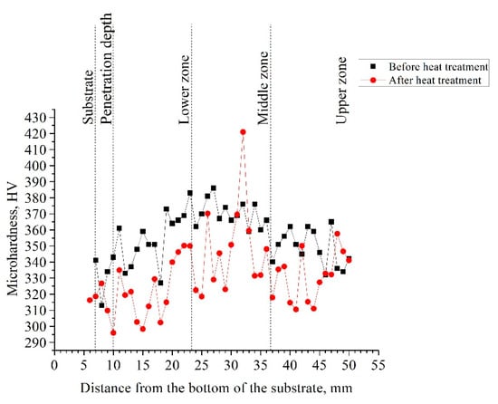 The microhardness measurements were performed along the vertical direction in the middle of the wall. The results for non-heat-treated and heat-treated specimens are presented in Figure 10. A decrease in hardness of the heat-treated metal is clearly observed in all of the WAAM metal zones; such an effect was also observed by Lin et al. [29].