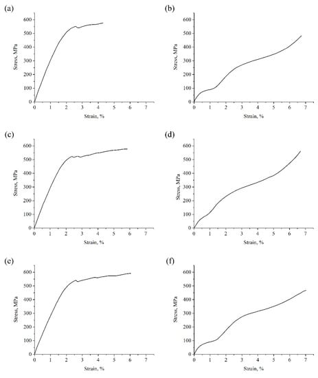 The resulting mechanical characteristics are similar to the results of other groups (Table 5) [21,25]. The results show notable changes in the shape of the stress–strain curves after the heat treatment. There is some non-linear zones of the stress–strain curves for the heat-treated samples around 100–150 MPa (Figure 11b,d,f), presumably, influenced by the stress-induced B2–R transformation, after which fully R-phase metal matrix deformed. As it was concluded from the DSC results (see Figure 8), the heat-treated metal matrix at room temperature consists of the R and B2 phase. The XRD results also confirmed this fact (Figure 9). Thus, during heat-treated samples’ deformation, two stress-induced transformations occur, namely B2 → R and R → B19′, that alter the stress–strain curve shape.