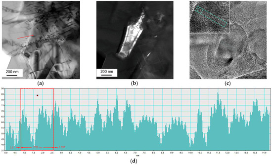 Figure 9 shows the submicrocrystalline structure of the AlGr composite. The lighter contrast of the graphene films made it possible to determine their morphologies and locations. They were visualized as rectangles from 100 to 250 nm in size and were found both along the dislocation boundaries and inside the grains (Figure 9a,b).