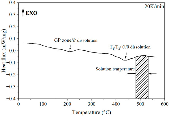 Differential scanning calorimetry (DSC) was used to verify the temperature range of solution treatment of 2060 Al-Li alloy obtained according to reference [13]. A thin-sliced testing sample weighing about 15 mg was taken from the as-delivered alloy sheet and cleaned with acetone solution and ultrasonic cleaner. The DSC test sample was protected by nitrogen atmosphere during testing. Figure 2 indicates the DSC measure curve of the initial cold-rolled alloy sheet. There are two endothermic peaks on the curves when the temperature is about 210 °C and 435 °C, respectively. The first endothermic peak, from 180 to 270 °C, is caused by dissolution of the GP region and δ’ phase generated under natural aging [14], while the dissolving reaction of T1/T2 and θ/θ’ phases contributes to the second one, approximately from 350 to 520 °C [15]. The solution temperature should be selected to increase the solubility of solute phases as far as possible on the premise that the alloy does not overburn. According to the DSC curve, the solution temperature of the 2060 Al-Li alloy is decided in the range of 460–540 °C.