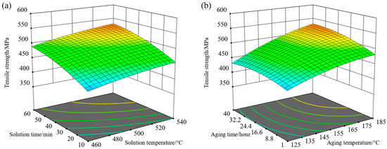 The Adjusted R2 of the quadratic response surface equation for tensile strength is 0.9808, which indicates that the response surface equation agrees well with the experimental results and depicts the effect of solution and aging process parameters on tensile strength. Since the response surface equation of tensile strength has four independent variables, it is impossible to be plotted with a three-dimensional surface. In order to analyze the influence of process parameters on tensile strength, it is necessary to assign two process parameters definite values, and, thus, the relationship between the other two process parameters and tensile strength can be plotted. Figure 3a shows the response surface of tensile strength under the aging treatment of 155 °C/20.5 h and describes the influence of different solution parameters on tensile strength. Similarly, Figure 3b presents the response surface of the tensile strength under the solution treatment of 500 °C/35 min and describes the influence of aging parameters on tensile strength.