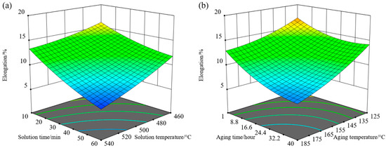 Response surfaces of elongation: (a) different solution temperatures and time; (b) different aging temperatures and time.