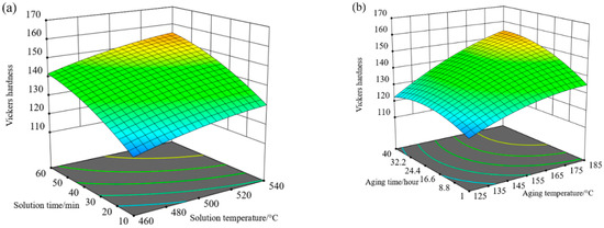 Response surfaces of Vickers hardness: (a) different solution temperatures and time; (b) different aging temperatures and time.
