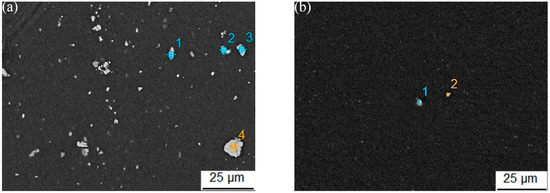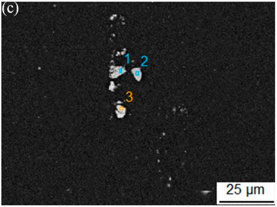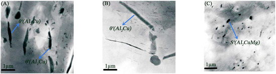The EDS analysis results are given in Table 4, corresponding to the element content identified in Figure 7. As can be seen from Figure 7a and Figure 8B, the initial material contains a large number of spherical and massive undissolved second phases, mainly the Cu-rich phases, the massive second phase is θ’ (Al2Cu) phase. Somewhat analogous second phases containing the elements Cu and Mn are also found in the 2050 Al-Li alloy [21]. It can be seen from Figure 7b and Figure 8B that after the solution treatment at 540 °C, the second phases in the NO. 3 specimen are almost completely dissolved, and the undissolved second phases with a size of 1–3 μm are occasionally found in the view field, massive θ’ (Al2Cu) phase still dominates. According to elemental analysis, it can be inferred that the compositions of the second phases are mainly a small amount of θ’ (Al2Cu), T(Al2Cu2Mg3) and S’ (Al2CuMg) phases, as well as the Mn-rich phases. It can be seen from Figure 7c and Figure 8C that, after the solution treatment at 460 °C, insufficient solution treatment leads to the residue of the second phases, mainly the Cu-rich phase, but the content of Cu atoms decreases while the content of Mg and Mn atoms increases, indicating that a part of Cu atoms are dissolved into the aluminum matrix, while some Mg and Mn atoms are enriched in the second phases.