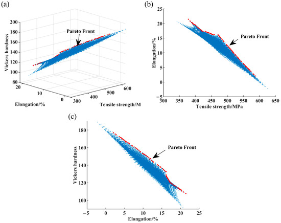 In Figure 9, the blue scatters represent the spatial distribution of possible solutions to the objective function, and the red scatters represent the Pareto frontier calculated by the NSGA-II algorithm. By multi-objective optimization algorithm, the distribution of the Pareto frontier is uniformly distributed on edge of the maximum directions of multi-objective function in solution space. It can be seen from Figure 9b,c that elongation decreases with the increase of tensile strength and Vickers hardness, and there is no absolute optimal solution that the maximum values of the three mechanical properties are taken.
