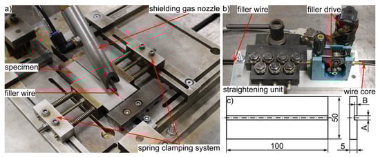 Welding setup. (a) Clamping setup with wire-feeding system; (b) miniDrive with a straightening unit for the filler wire; (c) sketch of the welding specimen with rectangular seam preparation.