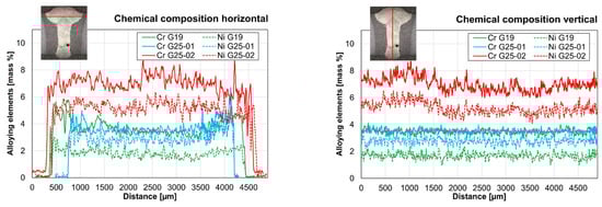 To analyze the chemical composition, EDS line scans were performed horizontally and vertically in the weld seam. The horizontal measurement line was set 0.4 mm below the component surface, starting and ending in the base material. It should be mentioned that some of the measurements were added together from several measurement lines, since the weld seam is larger than the maximum measurement field size. For this reason, the measured weld-seam width does not exactly correspond to the actual weld-seam width. Nonetheless, variations in the alloy composition can be clearly assigned to the specific areas of the weld seam (outer region near the heat-affected zone, center of the weld, upper part or lower part of the weld).