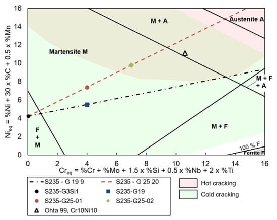 It is noticeable that the microstructures within the dissimilar welds seem to be more and more aligned when the Cr and Ni content increases (Figure 8, black dashed lines). While the microstructure in the weld with the G 19 9 filler wire is randomly oriented (Figure 8b), some orientation becomes visible with the welds produced by the G 25 20 filler wire (Figure 8c). In particular, the structure of G25-02 is reminiscent of butterfly martensite, which can occur at reduced Ms temperatures (Figure 8d).