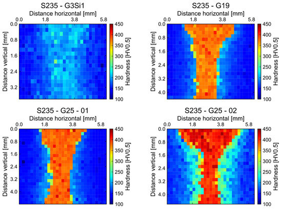 Hardness mapping of S235-G3Si1 (similar weld) showing a homogeneous hardness distribution and a slight increase in the weld seam. All dissimilar welds (S235-G19, S235-G25-01, S235-G25-02) have higher hardness values compared to the base material, while no sharp variation in hardness values can be seen within the welds.