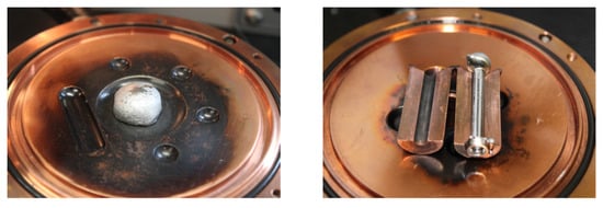 As the weld seam was narrow (maximum width of close to 5 mm only in the upper part of the weld), it was not possible to take dilatometer samples. For this reason, a combination of base material and filler wire was melted in an arc furnace (arc furnace MAM-1, Edmund Bühler GmbH). Base material and filler wire were cut up, cleaned, weighed according to the mixing ratio of the weld seam and melted under an argon inert gas atmosphere. The chemical composition of every melted sample was checked in order to make sure that it corresponded with the composition of the welds. In the furnace, a copper insert was then used to cast molten material by vacuum into a rod (Figure 6). The resulting rods were processed into hollow test specimens according to the specifications of ASTM standard A1033-18 [13]. Six dilatometer specimens that have the same chemical composition were produced. The specimens have an inner diameter of 3 mm, outer diameter of 4 mm and a length of 8 mm. The advantage of a hollow specimen is the achievable high cooling rate in order to simulate the cooling rate of the welding process.