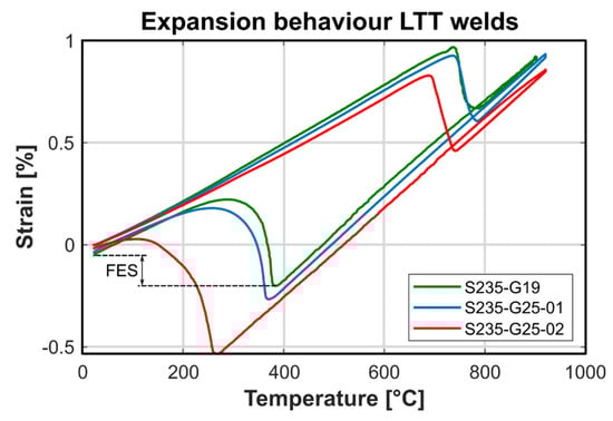 Dilatometry tests showed a martensitic phase transformation for every dissimilar weld, Figure 7. With increasing Cr and Ni content, the Ms temperature drops. With the reduction in Ms temperature, the strain during the martensitic phase transformation increases. This behavior was also observed in the austenitic phase transformation; however, the increase was not as pronounced. The final expansion strain (FES) describes the martensitic volume expansion from Ms to room temperature. It is noticeable that the FES increases with higher alloy contents. The higher the FES, the higher the compressive stress introduction in the weld seam [14,15].