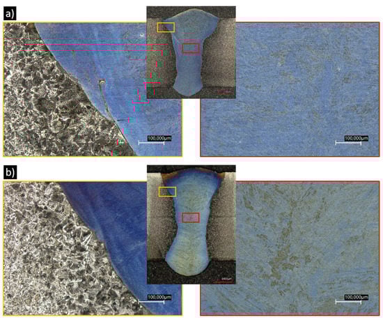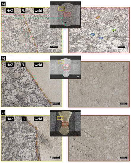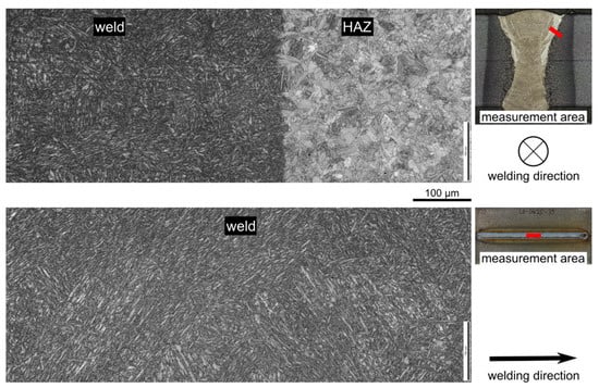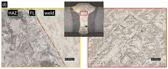 Some conclusions can already be drawn from the macro- and microsections. The etchant clearly highlights the similar weld. In this weld seam, pearlite, bainite and small martensitic plates can be seen (Figure 8a). Other than small pores, no other irregularities can be observed.