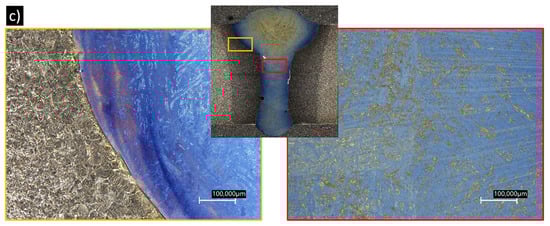 Color etching of the welded samples according to Lichtenegger and Bloech etchant (LBI). (a) S235-G19; (b) S235-G25-01; (c) S235-G25-02.